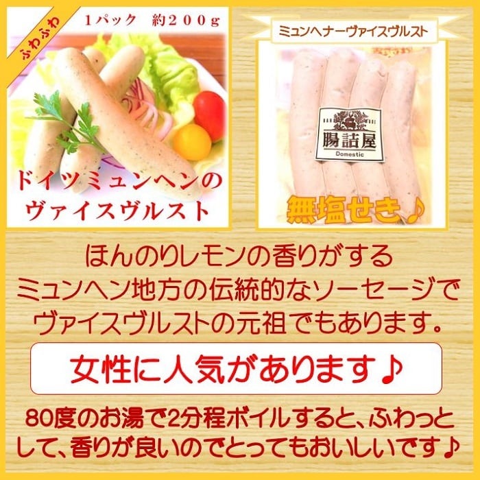 ミュンヘン地方では日曜日の朝食によく食べられるソーセージ ほんのりレモンの香りとパセリの香りが食欲をそそる、あっさりとしたソーセージです