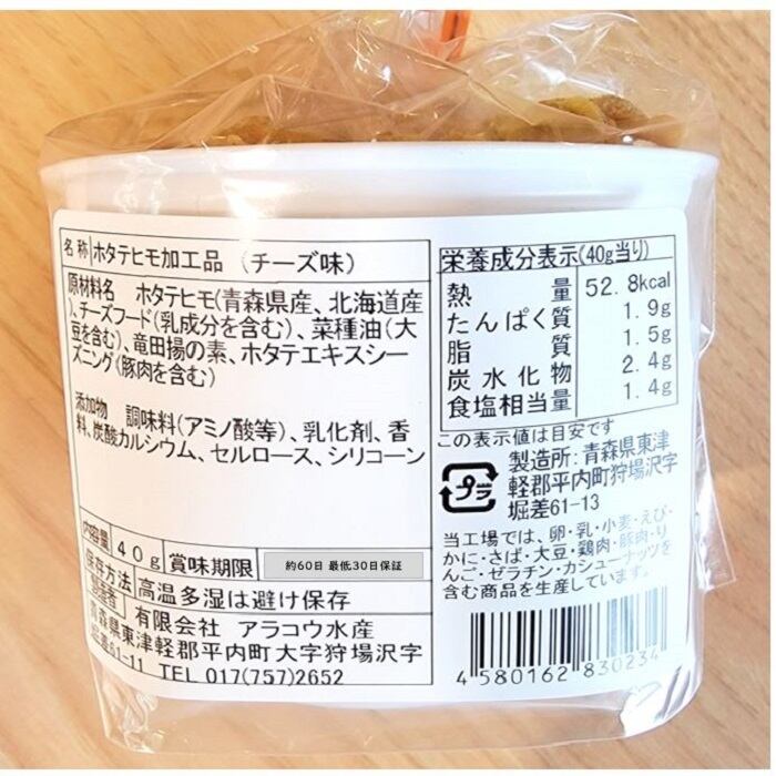 原材料名 ホタテヒモ(青森県産、北海道産)、チーズフード(乳成分を含む)、菜種油(大豆を含む)、竜田揚げの素、ホタテエキスシーズニング(豚肉を含む)/調味料(アミノ酸等)、乳化剤、香料、炭酸カルシウム、セルロース、シリコーン